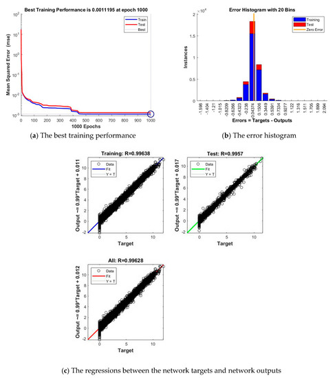 This process is entitled the Bayesian regularization [54]. The regularization is based on an adjustment of the objective function by adding to it a term consisting of the squares of the network’s weights. The regularization aims to obtain a very smooth response of the network to the above-mentioned adjustment. The detailed mathematical formalism can be found in two reference papers: McKay [57] introduced the algorithm for the first time, while Foresee et al. [58] made further improvements to it.