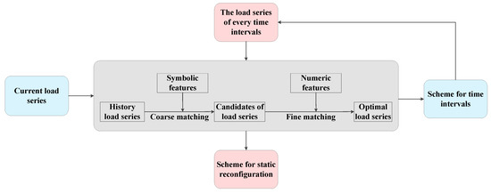 Scheme for static reconfiguration: For one thing, calculating the mean load for each node in every time interval and several candidates of load series are screened out in coarse matching stage according to the symbolic features of the load series. For another thing, taking the load of each node as the original feature, the principal component analysis is used to reduce the dimension of the numeric features whose weights are determined by entropy weight method. The dynamic time warping is calculated to evaluate the similarity between the current load series and the candidates of load series, and the optimal scheme for static reconfiguration is selected according to dynamic time warping distance. Different from the dividing time intervals, if the selected strategy is applied to distribution network directly, it may cause some inequality constraints to be unsatisfied. Therefore, we need to apply the selected strategy to the distribution network and then calculate the power flow. If all constraints are met, the selected strategy can be used. Otherwise, reselect the strategy in the remaining cases and then check if the constraints are met.