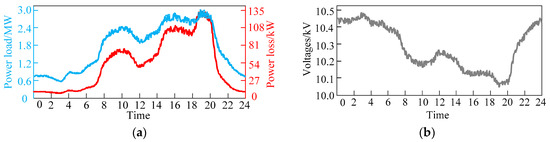 The parameters of the distribution network: (a) The daily load curve and power loss of distribution network; (b) the voltages of distribution network.