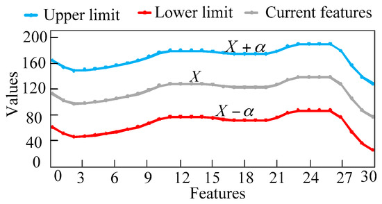 historical cases which are similar to the current case will be selected by the classification tree. In order to reduce the computational tasks, the historical cases are screened two times by setting a threshold. As shown in Figure 6, set the allowable deviation of the feature as , and exclude the candidate cases whose values of features fall outside the allowable range to further reduce the number of candidate cases. If the number of candidate cases is large, can be set smaller to exclude candidate cases that are not very similar to the current one. On the contrary, if the number of candidate cases is small, can be set to a larger size to avoid all candidate cases being excluded. If it is difficult to determine the value of in the first place, dichotomy can be used to quickly determine the size of .