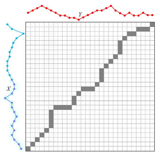 As shown in Figure 7, the DTW attempts to find a best warping paths with a minimum distance value. First, it needs to construct a matrix D with size . We can calculate the every element of the matrix as follows: