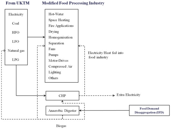 The UKTM in its original form studies the energy usage of its sectors at relatively high levels, which does not provide improvements to specific industries within each sector. Hence in this study, the processing sector of UKTM was further disaggregated, as shown in Figure 2, to include the food processing sector in Table 1, as well as all the technologies found in Table 2. Figure 2 shows that the Energy inputs obtained from the original UKTM are fed to the technologies used in the modified food processing sector, based on the food demand constrained to the model. The model also accounts for the use of Anaerobic Digesters and Combined-Heat Power (CHP) systems to generate onsite electricity and heat. Any excess electricity or biogas is assumed to be released to the grid, although priority is given to onsite usage.