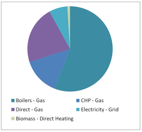A survey of the UK food manufacturing industry by the Food and Drink Federation (FDF) reveals the energy consumption distribution to be as shown in Figure 3. We observe that heat generation from gas boilers represents a significant proportion (56%) of the energy used in the industry, followed by direct gas heating (22%), natural gas Combined Heat and Power CHP (14%), grid electricity (7%) and biomass direct heating (1%). These data have been integrated into the model to represent the base year technologies, and enable the model to build on this database to predict future technology mix in the industry, based on the linear optimisation model described in Section 2.1.
