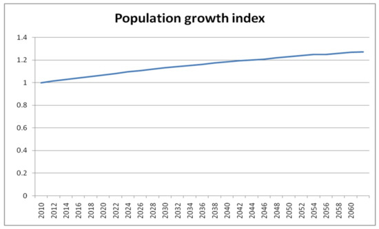The demand for the food manufacturing sector was also divided according to the SIC classifications used throughout this study. Demand is assumed to increase with the expected growth rate of the UK population, based on ONS estimates as shown in Figure 4 [44].