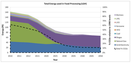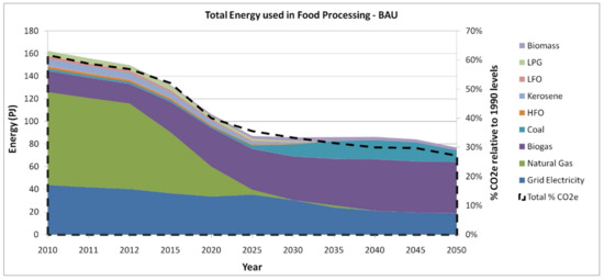 Figure 5 shows the variation of the energy consumption and emissions of the food manufacturing sector in 2050 based on the Business As Usual (BAU) scenario where the projections do not include any constraints on GHG emissions, but rather, the food industry uses the lower-cost technologies and energy vectors for food production to satisfy demand. The shaded areas represent the energy consumption in PJ, whilst the dotted line represents the reduction in GHG emissions, relative to 1990 levels. It should be noted that the CO2e emissions rate at the start of the modelling period in 2010 is 60% that of 1990, based on estimates of reductions achieved by the industry between 1990 and 2010, provided by the Food and Drink Federation [45]. It can be seen from Figure 5 that in the BAU scenario, reduction in CO2 emissions will reach 28% of 1990 levels, a reduction of 32% over the simulation period. This demonstrates that even without the imposition of GHG emission constraints on the food industry, it will be economically more beneficial for the industry to migrate from fossil to low carbon fuel and technologies. It can be observed from Figure 5 that this migration will take place through the replacement of LPG, LFO, Kerosene, HFO, Coal and Natural gas by biogas and biomass. Biogas is then primarily used to produce electricity through CHP technologies as shown in Section 3.3. In this case, the benefits arise from the use of biogas and biomass which are produced from wastes, as shown in Table 3, generated in the food factories, as opposed to having to purchase energy feedstock from the market.