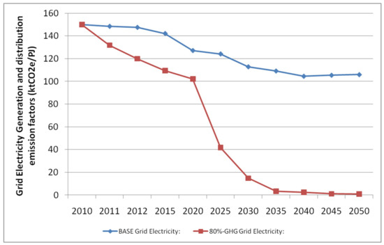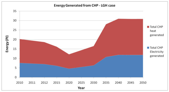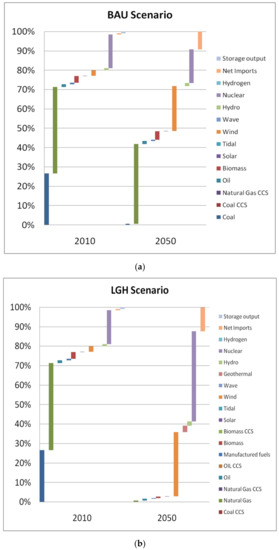 The main difference between the BAU and the LGH cases arises from the fact that the emissions associated with grid electricity are lower in the LGH scenario, as obtained from UKTM. In the UK, power generation produces the highest amount of emissions (36% of all emissions) [11] and also has a high potential of emissions reduction due to the current dominance of fossil fuels. In this regard, the UKTM model has shown that with the imposition of the 80% GHG reductions, associated carbon emission factors with power generation and grid electricity will also change as shown in Figure 7. This results from a drastic change in the fuel sources used to generate electricity, i.e., a drastic shift from fossil fuel to renewable and nuclear sources of energy, as shown in Figure 8.
