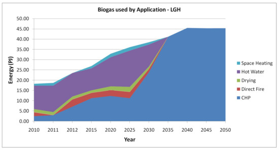 End-Use of biogas generated from anaerobic digesters in the LGH case. (Note that legends and colours in Figure 9 are aligned in sequential order for ease of interpretation).