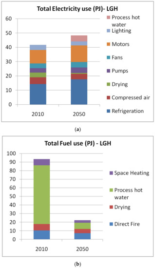 (a) Electricity end-uses in the LGH case; (b) fuel end-uses in the LGH case. (Note that legends and colours in Figure 10 are aligned in sequential order for ease of interpretation).