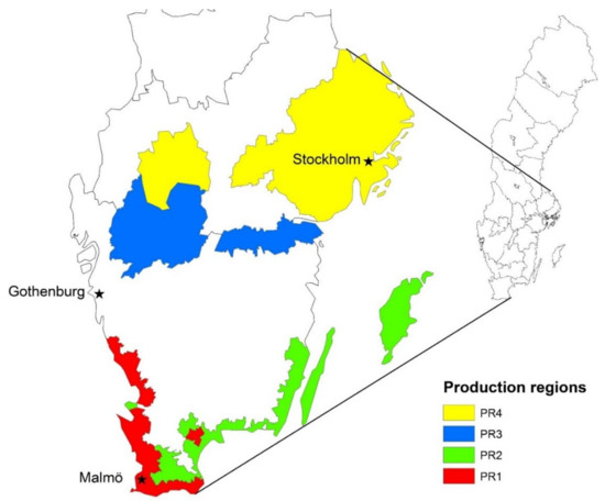 - Larsson, S. Sveriges Jordbruksområden—En Redovisning av Jordbruksområden och Växtzoner i Svenskt Jord- och Trädgårdsbruk; Field Research Unit, Swedish University of Agriculutural Sciences: Uppsala, Sweden, 2004; p. 13. [Google Scholar]