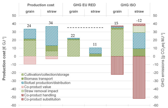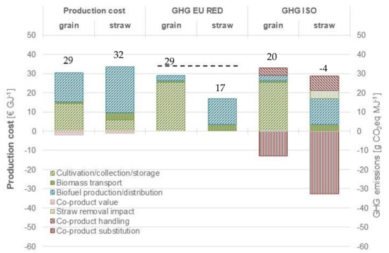 GHG emissions and production costs were calculated for ethanol and biogas from both wheat grain and wheat straw. The purpose was not only to present updated and comparable values for these biofuel production systems, but also to identify drawbacks and benefits if residues are prioritized over energy crops for the production of biofuels. Based on our base case assumptions, Figure 3 and Figure 4 show production cost and GHG emissions, calculated according to the EU RED and the ISO methodology, for the production of ethanol and biogas from grain and straw originating from PR1. For straw, the results given here include the removal of fraction 3 only (see Section 2.1). To exemplify how reduced GHG emissions could be given an economic value, the results are also applied in the context of the Swedish GHG reduction mandate.
