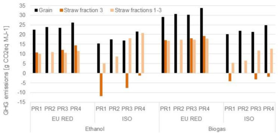 The ISO calculations showed a more complex picture. As shown in more detail for PR1 in Figure 3 and Figure 4, the different methods applied for handling co-products gave less GHG emissions for grain and straw fraction 3 in all PR. In addition, the ISO calculations included the potential negative impact on SOC when all straw was collected (fractions 1–3). This SOC impact was the main reason to the higher emissions when comparing the use of straw fractions 1–3 to removal of only straw fraction 3, the benefit of the shorter transport distance only having a minor impact. This illustrates how relevant emissions or avoided emission can be missed when the method is as simplified as in the EU RED.