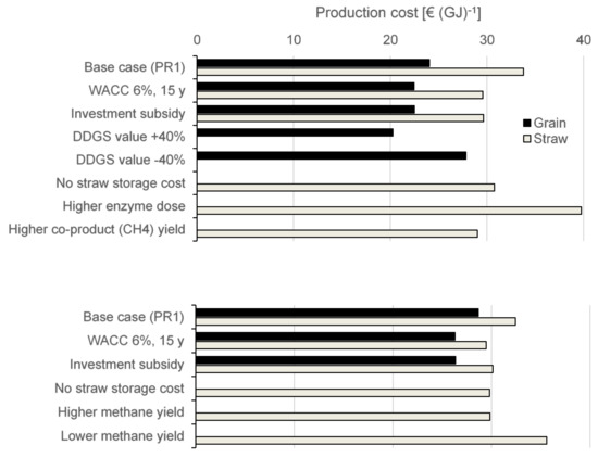 In the production of ethanol from straw, the location of the plant—so as to ensure a sufficient regional supply of feedstock—has been identified as an important factor for economic feasibility [23]. Production based on an annual straw supply of 120,000 to 200,000 t DM has been considered necessary to give economies of scale in previous Swedish studies [23,24,25,26]. In the present study, calculations are based on an annual straw supply of 200,000 t DM and process performance was optimized by applying high-DM fermentation and organic acid pre-treatment [26].