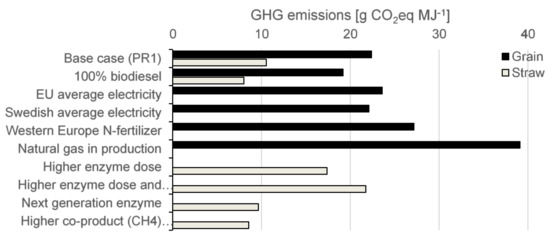 When considering straw for ethanol production, the uncertainty in the experimental co-product yield of biogas was taken into consideration by using a low yield in the base case. The impact of a higher yield was also evaluated, which leads to additional processing emissions, and the net impact on GWP and costs is reported in the results. Other aspects evaluated were the enzyme dosage and the GHG emissions resulting from enzyme manufacturing.