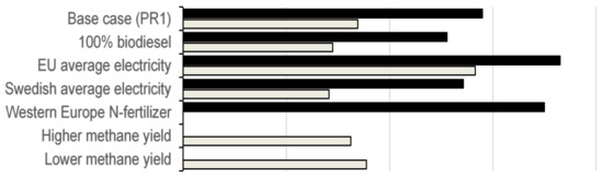 There are currently 62 plants in Sweden producing biogas of vehicle fuel quality [28]. In 2016, the feedstock at these biogas plants was mainly sewage sludge, manure and various kinds of municipal and industrial organic waste [29]. Although most biogas plants use a mixture of feedstock, the data used in this study are based on a previously published study in which model calculations were applied to plants using grain or straw only [27].