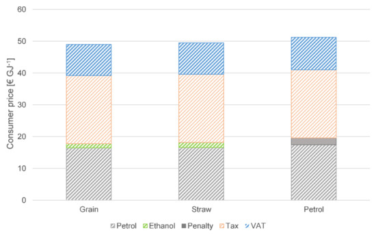 The cost is higher when using straw as feedstock than when using grain. However, the production cost for biofuels based on straw is still lower than the market price of petrol (€39/GJ,) and comparable to the prices of diesel and CNG (€32/GJ) including taxes. It is notable that the cost of grain has a substantial impact on the overall biofuel production cost, while the costs for the collection and storage of straw are not so important and that straw is a cheaper feedstock, even when the transportation cost is included.