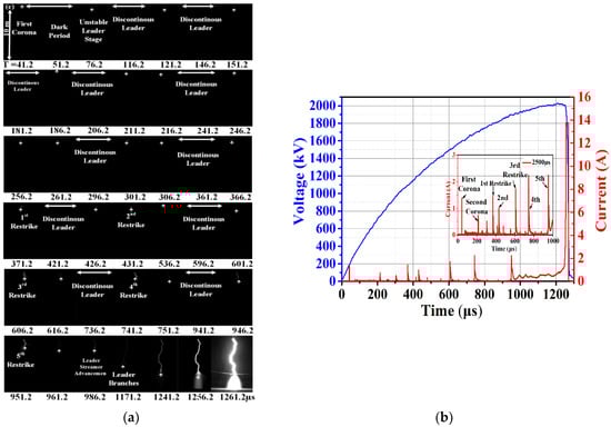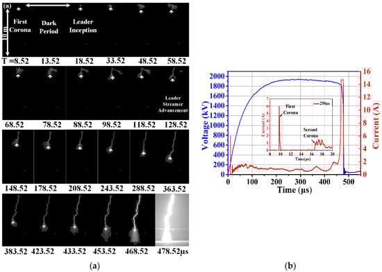 (a) Framing photographs of the (positive discharge) in the 10-m rod–plane configuration under long front impulse. (b) For 2500 µs, the inset in the voltage and current is the (partially enlarged) first corona current under a long front impulse voltage.