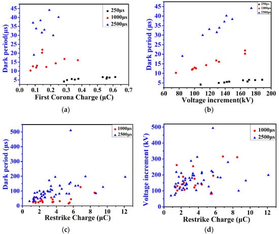 The relationship between the first corona charge (Q) and the dark period (Td) with a rise time of 250 μs, 1000 μs and 2500 µs is presented in Figure 5a,b. The literature related to long air gap discharge suggests that humidity influences the streamer to leader transition by decreasing the duration of the dark period. The physical parameter corona charge is suitable to define the stem-leader transition, which occurs due to transfer of energy (electrons, neutral molecules) in the stem [,]. The streamer leader during the inception stage depends on the stem leader transition, and the inception of streamers front across the gap. The moving anode region represents the streamer front, and the removal of electrons from the gas through photoionization, as well as the space charge produce the choking effect of the electrical field around the leader tip. The propagation of the leader tip in the gap maintains the (electric field) in the corona active front. On the other hand, it supports the ionization phenomena required for streamer propagation. However, the positive ions decrease the electric field near the rod tip. Moreover, this delays the streamer inception in front of the stem. Gallimberti proposed [] the duration of the dark period and applied voltage growth, and the increase in the rate of injected charge by the first corona (choking effect) shows an important influence of the absolute humidity.