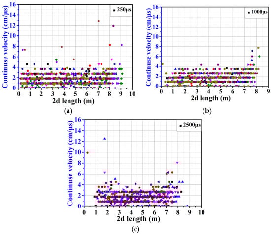 Continuous leader velocity of 10-m rod–plane gap under switching and long front impulse versus axial length. (a) For 250 µs (b) For 1000 µs (c) For 2500 µs.