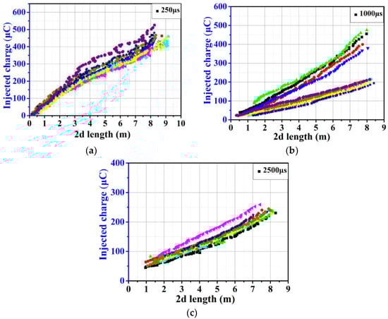 Injected charge vs. leader length in a 10-m rod–plane configuration under switching and long front impulse. (a) For 250 µs (b) For 1000 µs (c) For 2500 µs.
