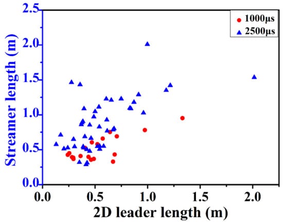 In Figure 2 and Figure 3, a typical streak of restrike images of positive leader propagation in a rod–plane configuration is presented. Here, the leader tip and the streamer zone are depicted. The corona region ahead of the leader tip is called the streamer zone. In [], Gallimberti proposed the mechanism related to streamer to leader transition and showed that air in the streamer (stem) is heated because of the injected electrons formed in the streamer zone. Furthermore, injected electrons depend on the streamer zone length, as well as the electric field (ambient). The discharge propagation sustained by the streamer-leader transition remains until the first streamer of the leader corona reaches the plane. The final jump length is considered to be the maximum streamer length during the continuous leader propagation phase. These experimental results show that the average streamer length is 0.518 m, and 0.878 m under a long front impulse (1000 µs and 2500 µs). This implies that the greater average streamer length is achieved, and the proposed method has higher 2D leader length of 2500 µs, compared to 1000 µs, as illustrated in Figure 8. Furthermore, the average final jump length is 2.27 m under switching impulse conditions, while the average final jump length of long front impulse is 1.81 m and 1.75 m. However, the average final jump length under standard impulse is greater than that under long front impulse voltage. The reason is that the streamer zone length is larger, so the injected electrons are higher in number during the final jump stage as compared to other cases.