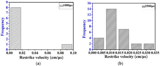 The velocity probability distributions of 19 and 46 restrikes under 1000 µs and 2500 µs cases, respectively, are illustrated in Figure 10. These restrike are divided into five time intervals. In 1000 µs, the time interval lies in the range from 0.01 µs to a maximum value 0.02 µs, while for the 2500 µs case, the time interval lies in the range of 0.0105 µs to 0.014 µs, as illustrated in Figure 10. This implies that greater restrike velocity is achieved and the proposed method has a higher probability distribution for 2500 µs, as compared to 1000 µs.