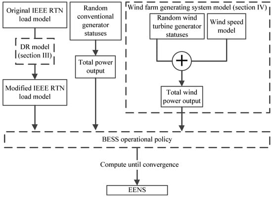 An overview of the simulation process is given in Figure 1 to provide a clear illustration. The figure shows that the modified load curve based on the DR model and the total power output from the conventional generating system and wind farm are analysed based the operation policy of the BESS. The wind farm power output takes into consideration the wind speed model. On the basis of the choice of the BESS policy, the total load demand and power supply are compared to determine the adequacy of power supply. Depending on the choice of the BESS policy, additional power may be supported or stored in the BESS. The process is simulated until the EENS converges, which indicates the adequacy of the power supply.