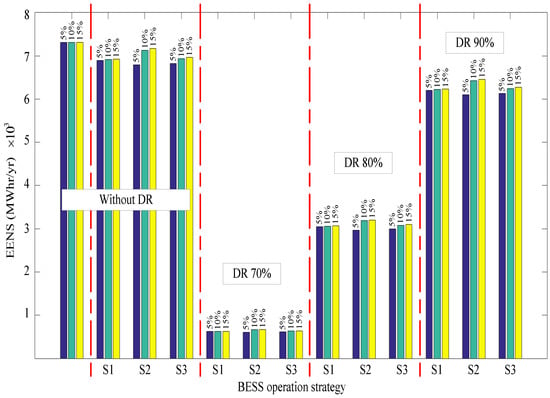 Regardless of the BESS operation strategy and penetration levels of wind energy, the DR 70% group consistently recorded the lowest EENS. The results will be investigated further in subsequent sections. The enlarged view of the DR 70% group is shown in Figure 3.