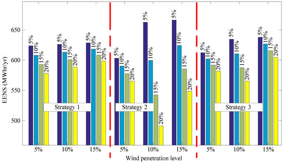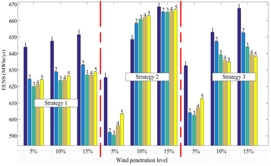 The results in Figure 3 show that, when the wind penetration level is at the lowest (−5% of the peak load) and when similar charging and discharging cycles are compared, strategy 2 of the BESS operating policy has the lowest EENS values. For example, the EENS value of the one-hour charging cycle in strategy 2 is the lowest among the other two one-hour charging cycles in strategies 1 and 3. The same observations are noted for the other charging cycles. The greater adequacy of the generating system given by strategy 2 is not due to it being more robust than the other strategies. Rather, it is due to the low wind power penetration level, and during this time, the majority of the load is supplied by conventional generators that have more dispatch flexibility. Hence, the EENS values are among the lowest due to the high reliability of the conventional generators but not due to the operating strategy of the BESS.