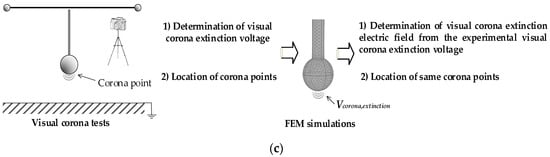(a) Experimental setup for ac tests. A similar setup was used for the direct current (dc) tests; (b) Sketch of the spherical electrode configuration; (c) Diagram of the proposed approach to determine the visual corona extinction electric field. FEM: Finite element method.