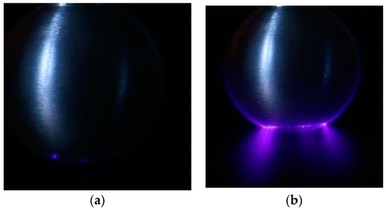 Results presented in Table 5 show a similar behavior to those shown in Table 3, since the lowest visual extinction point corresponds to negative dc corona, whereas the highest one corresponds to positive dc corona, and so the visual ac extinction point falls between them. In addition, according to Table 3, the results presented in Table 5 correspond to radiuses in the range 4–8 mm, which are corroborated in Figure 8d (see the region with the red circle where corona starts).