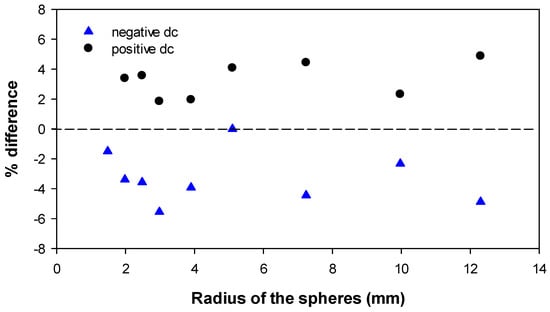 Percentage difference of the visual corona extinction electric field strength versus the curvature radius of the sphere. The ac value is taken as the reference.