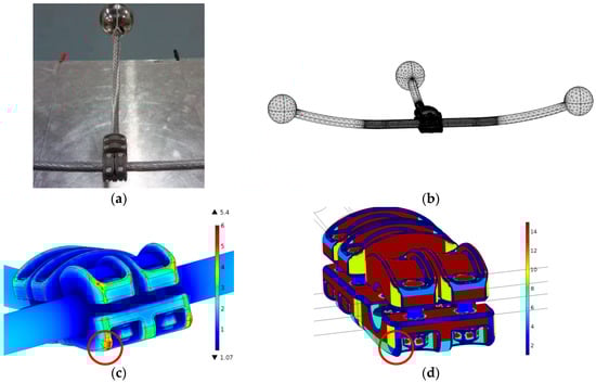 (a) Experimental layout with the center of the conductor placed at a height of 225 mm above the ground plane; (b) Mesh used in the FEM simulations of the connector, conductors and sphere corona protections; (c) Surface electric field in kV/mm resulting from FEM simulations; (d) Geometrical radiuses of the connector in mm.