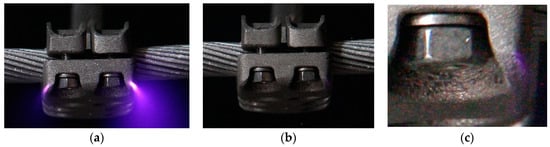 Since most of the radiation produced during corona processes falls within the ultraviolet spectrum, corona discharges are not visible in daylight, so visual corona must be detected in total darkness [24]. By using high-performance digital cameras, more sensitivity is attained compared to the traditional naked eye observation [25]. It is worth noting that visual corona testing allows identifying the areas of high-voltage hardware, which are more prone to corona appearance, thus facilitating the application of corrective actions to obtain an optimal design under test. Although corona can also be detected by using specific equipment involving partial discharges or audible noise detectors as proved by Chen et al. [26], or radio interference voltage measurements [27], such methods do not provide a direct visual location of the corona discharge points, although, in some circumstances, and by using multiple sensors, they can locate the discharge points, as proved in the works of Dong et al. [28] and Robles et al. [29].