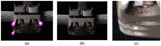 (a) ac corona at 77.75 kVRMS; (b) ac corona near the extinction point at 58.5 kVRMS; (c) Zoom of Figure 11b.
