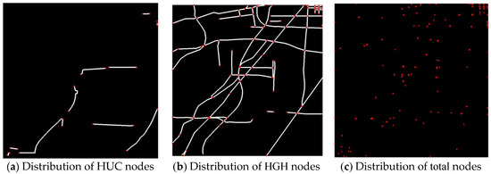 f.ACO and CS are introduced to solve our route optimization problem. It is crucial to transfer the specific unresolved issues to the natural phenomena proposed by the algorithms. According to the regulations mentioned above, the heating route is preferred along the road. Therefore, it is a good idea to transfer the continuous image to discrete segments by breaking the roads into a number of segments at the intersections. The two endpoints of every segment are treated as the elementary entities (nodes). For example, in the ACO algorithm, the nodes can be compared to the cities; in the CS algorithm, the nodes can be compared to the location of eggs. Thus, we can derive a distance matrix from the node distribution as shown in Equation (2).