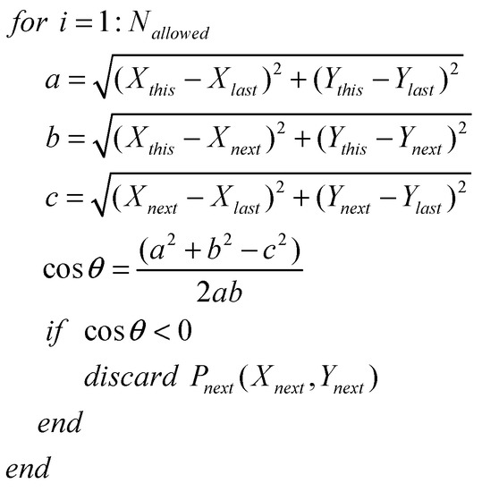 where Nallowed is the number of the residual nodes still unvisited. is one of the points from the allowed vector, while and are the current point and the previous point.