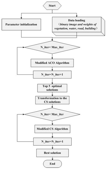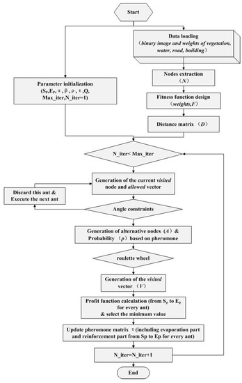 Similar to the modified ACO, the start point (SP), end point (EP), nodes (N), binary image of HUC (imgC), binary image of HGH (imgH), binary image of building (imgB), binary image of vegetation (imgV), binary image of water (imgW), and the weights of every land cover type (w)were initialized. Then, the distance matrix can be generated by Equation (3).