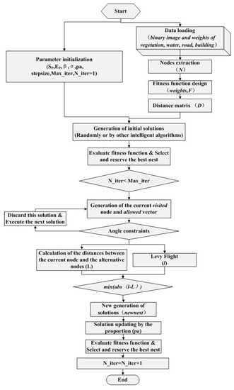 Based on the initial solutions and the distance matrix, the best solution can be chosen and saved by comparing the value of the fitness function. Afterwards, the iterations were conducted and the new solutions by Lévy flights can be generated. The solution generation and updating were also confined from the start point to the end point.