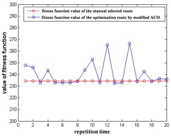 Figure 11. The average value was 240.620, while the best performer was 232.343. Compared to the fitness function values of the manually selected route (234.300), the modified ACO derived a decent solution. However, the stability was not good: among the 20 repetitions, there were 8 times the fitness function values were still high after 1000 iterations.