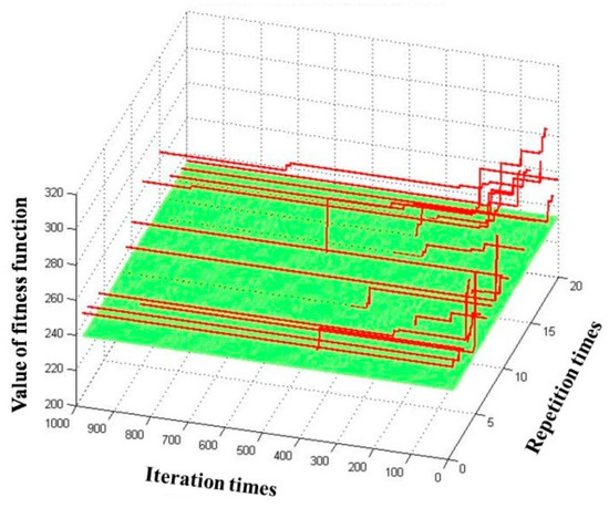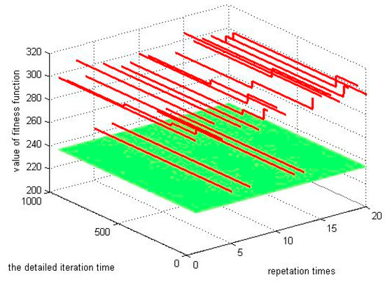 We also set the number of iterations as 1000 for the modified CS algorithm and repeated 20 times to verify its stability. The final fitness function values after 1000 iterations with 20 repetitions are shown in