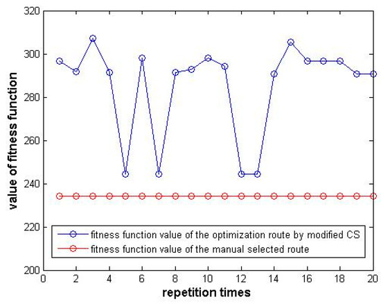 Figure 17. From the 3D diagram, we found that the convergence of the modified CS algorithm was not as good as the modified ACO. Although there was a 100% chance that the modified CS algorithm can achieve the minimum value after no more than 400 iterations, the final fitness value was still much higher than the manual selected route. This situation also confirmed the advantage of the CS in a local search, but not as well in a global search.