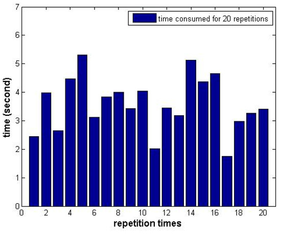 Figure 18. The average elapsed time was 3.97 s. Considering the 1000 iterations and 5 solutions for every run, the time consumed for one solution was approximately 0.794 ms, which was much more quickly than the modified ACO.