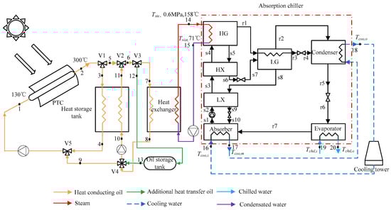 The flowchart of the proposed double-effect LiBr–H2O absorption chiller system driven by PTC is shown in Figure 1 The complete system consists of a solar heat collecting subsystem, a heat storage subsystem, a heat exchange subsystem, and a double-effect LiBr–H2O absorption chiller driven by steam. Sunlight is irradiated on a parabolic reflector and is reflected on the absorber by a mirror. The heat conducting oil (HCO) into the absorption tube (state 1) is heated to a high temperature (state 2). Subsequently, the high temperature HCO (state 7) enters the heat exchanger to produce steam (state 14), and the low temperature HCO is returned to the PTC through heat release (state 8). The steam with high temperature and high pressure is used to drive the absorption chiller to produce chilled water for space cooling (states 19 and 20). The steam releasing heat becomes the condensated water (state 15) and then returns to the heat exchanger.