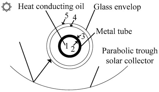 A solar PTC mainly consists of a parabolic mirror, a glass tube, and a metal tube [26], and this is shown in Figure 2 The parabolic mirror uses aluminum or silver to reflect solar radiation to the surface of the metal tube and is covered by a coating with high absorptivity and low emissivity; it then heats the HCO in the metal tube. The space between the glass tube and metal tube is set to vacuum to reduce heat loss.