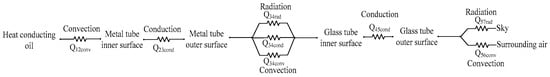 The heat transfer process and the thermal resistance model considering one-dimensional heat transfer is shown in Figure 3 [27]. The solar radiation is reflected onto the glass tube through the parabolic mirror. The reflected sunlight passes through the glass tube to reach the outer surface of the metal tube. The metal pipe is heated owing to the higher density of sunlight on the outer wall of the metal tube, and the thermal energy is then transmitted to the working fluid, HCO, through heat conduction and convection, in that order. Thus, the flowing HCO is heated to collect solar heat.