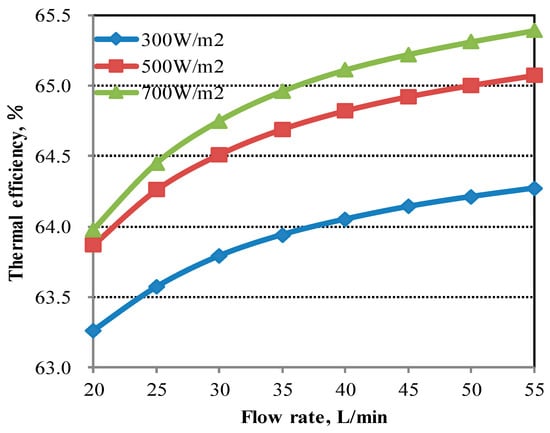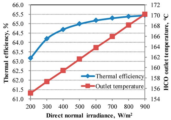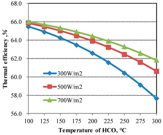 The variations in heat collecting efficiency with the DNI and HCO temperature (from 100 °C to 300 °C) are shown in Figure 5, when the flow rate of HCO is 47.8 L/min. It is observed that the thermal efficiency decreases with the increasing inlet temperature of HCO. The lower inlet temperature results in a higher temperature difference between the metal tube and the HCO and enhances the heat transfer of the solar collector. Additionally, the decline of efficiency at the DNI of 300 W/m2 from 65.5% to 57.7% exceeds that at 700 W/m2 from 66.0% to 61.8%. This indicates that the higher inlet temperature of HCO influences the thermal efficiency more evidently at the low DNI.