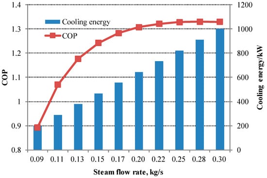 Variations in the cooling load and COP with respect to the steam flow rate.