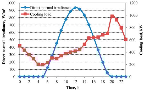 In order to analyze the performances of the complete system including solar collecting subsystem and absorption chiller, a hotel building in Beijing (north latitude 40° and east longitude 116°) is selected as a case study [35]. The hourly cooling loads were simulated using the Software DeST through setting the occupancy schedules of people, electric equipment, and light, among others. The hourly cooling loads and solar irradiance in a typical day (15 July) are shown in Figure 8.