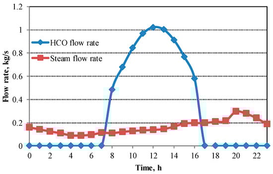 From Figure 9, it is observed that the variation curve of steam flow rate shows a trend similar to the variation in the cooling load in Figure 8. Additionally, the flow rate of the HCO matches the change in the DNI to stratify the constant outlet temperature of PTC. When the solar DNI is below 400 W/m2, the solar collector does not work, and the solar collector works for nine hours from 08:00 to 16:00 in a typical day. During other times, the collector system is unable to collect the heat for the refrigeration cycle, and the HST supplements the heat demands as the heat source.