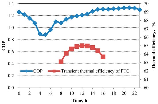 As shown in in Figure 10, the collector efficiency reaches a maximum value of 65% at the highest DNI, and the collector efficiency does not exhibit significant changes during its work time. The heat collected is used to produce the cooling energy in its work time and is stored in the HST to drive the absorption chiller in its non-work time. Thus, there are nine hours (from 08:00 to 16:00) to collect heat for the 24 h of cooling demands shown in Figure 8, and the results indicate that approximately 73% of the collected heat of the PTC is stored in the HST for heat demands in the night or daytime with no solar radiation (from 15:00 to 07:00). As discussed in the section on the COP variations with the steam flow rate in Figure 7, the COP also exhibits a trend similar to the cooling loads. The minimum COP is approximately 0.884 at the lowest cooling load, while the maximum COP reaches 1.332 at the highest cooling load.